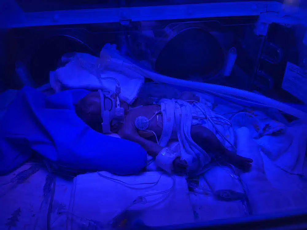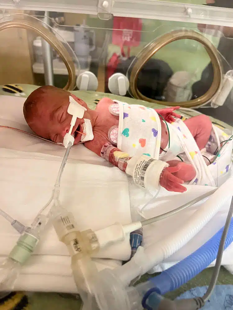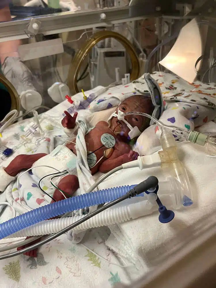 “Dr. Claassen was amazing and took charge of the entire situation. She made sure even though we were separated, that I had opportunity to see my baby,” Hannah said. “She explained they were arranging for a helicopter to come get him and take him to SSM Health Cardinal Glennon.” said Hannah. There was considerable fog that day, so the helicopter couldn’t fly right away. But within almost an hour, SSM Health Cardinal Glennon’s transport team arrived on the scene. Members of the team encouraged Hannah to put a transport blanket in her shirt while they talked. Her scent would then travel with Dean in the incubator on the way to the Neonatal Intensive Care Unit (NICU). After just a few short moments, transport team members secured Dean in the NxtGen Transport Incubator. The NxtGenTransport Incubator is the most innovative neonatal transport technology on the market and SSM Health Cardinal Glennon is the first in the country to have two of them adapted to fly in the transport helicopter. Dean was transported safely to Cardinal Glennon within minutes of leaving St. Clare and was admitted to the green hall of the NICU. Hannah recovered at St. Clare that evening, with plans for her and Dominic to join Dean at Cardinal Glennon the following day. “No one can prepare you for seeing your child for the first time in the NICU,” Hannah said. “He was intubated, on a ventilator, with so many tubes attached to him. He seemed so tiny and fragile.” “To see your child being kept alive by equipment is humbling,” said Dominic. “We realized quickly from the moment Hannah delivered, how much we needed to trust people with our son’s life. You take a leap of faith because you have to, and you don’t have a choice. All you can do is stay involved, ask lots of questions, and pray for the best.” said Dominic. “Having him at 25 weeks meant he had more than his fair share of risk factors,” Hannah said. Dean’s lungs were premature, so he developed BPD (bronchopulmonary dysplasia). He had jaundice that needed to be treated by bili lights. He had a PDA (patent ductus arteriosus), which is an opening between the two major blood vessels leading from the heart. He had a grade 1 and a grade 4 brain bleed on separate sides of his brain. He also developed MRSA (methicillin resistant staph aureus) which is hard to treat and a bad bacteria resistant to certain antibiotics, he had two spinal taps to see how far the MRSA had spread. Dean also had multiple blood transfusions throughout his NICU stay.