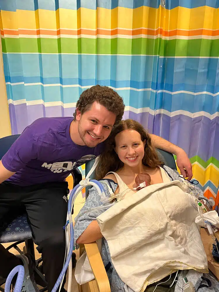 The EMTs got Baby Balassi breathing and his heart circulation pumping, but they needed Hannah’s heat to keep him warm for transport to the hospital. “They helped me stand up off the toilet and walk to the stretcher. Once I was laying down, they put him on my chest,” Hannah said. “One of the EMTs continued bagging and another doing chest compressions on my baby on top of me while they wheeled us to the ambulance. They never stopped working on him the whole time we rode, or when we rolled out of the ambulance as we arrived to St. Clare.” Hannah and her baby arrived via ambulance to SSM Health St. Clare in Fenton, MO. “The double doors to the Emergency Department opened and there were 20-30 people standing there waiting for our arrival. They took him quickly off me to work on him and put me in a room across the hall.” Hannah said. Colleen C. Claassen, MD, was the neonatologist on call.