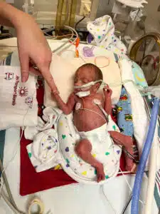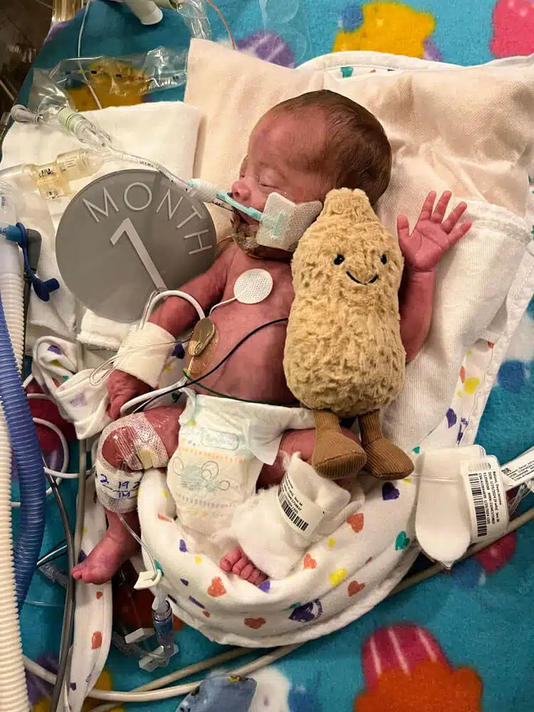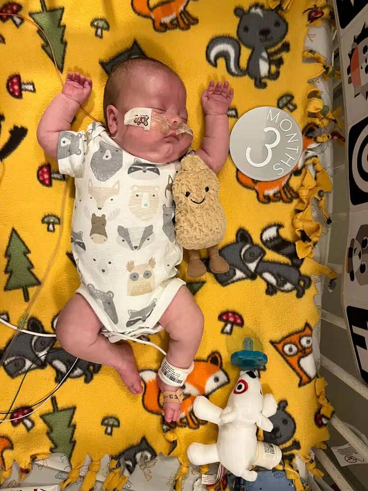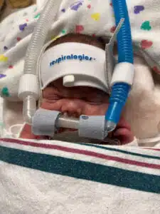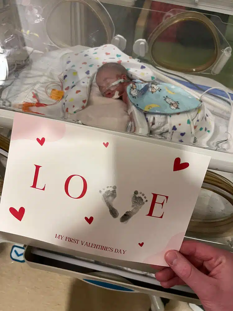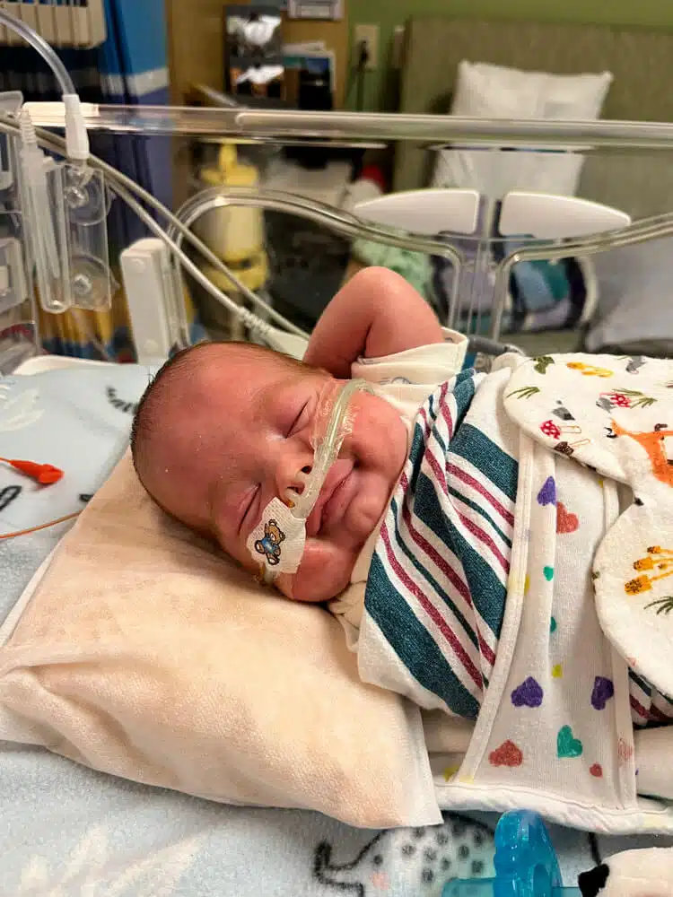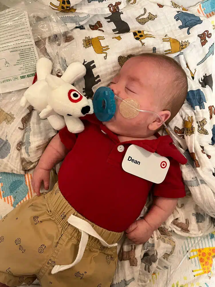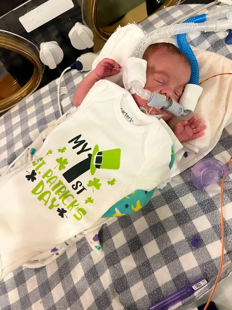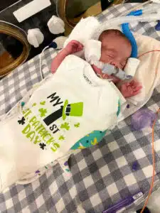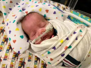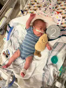 “We were in the NICU every day with him while he was in the hospital,” Dominic said. “We had primary nurses and felt like we really had a team that loved our son. That helped a ton to give us peace to go home at night and eventually have a routine once I went back to work.” Dominic said. “Aside from nurses and doctors, so many other people were helping Dean progress and helping us normalize life as NICU parents,” said Hannah. “Dean had Occupational Therapy, Physical Therapy, Speech Therapy and Music Therapy. We had Child Life services, the March of Dimes Family Support Group, and many other services and things that we’re sure he had too!” Said Dominic. “We celebrated our first Valentine’s Day, Easter and Mother’s Day in the NICU. The activities, keepsakes, the photos, the custom outfits made for holidays – all of those things were greatly appreciated.” said Hannah. “The Music Therapist would even leave us notes to let us know how Dean would calm down in response to music and singing. Being able to watch our Dean on the NIC View camera – helped us feel comfortable in seeing him being cared for when we could not be there.” said Dominic. “Many times, we felt like we took a nice step forward but then there were always a few steps back,” Dominic said. “Our little guy was only 1lb. 8 oz. when he got here, but somehow, he powered through the obstacles like a champ. His brain bleeds each resolved on their own with minimal damage. His PDA ended up not needing surgical intervention. He made his way from being intubated on a conventional mechanical ventilator to extubated on a nasal cannula to reintubated to self-extubating himself causing him to be reintubated to extubated on Babi CPAP to RAM cannula on CPAP then to nasal cannula. None of this wasn’t without bumps in the road, but knowing what he MIGHT have had to face, we are grateful he did as well as he did.” said Dominic.