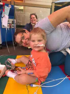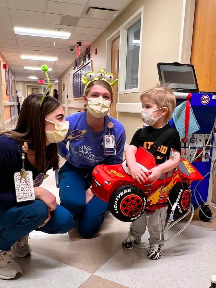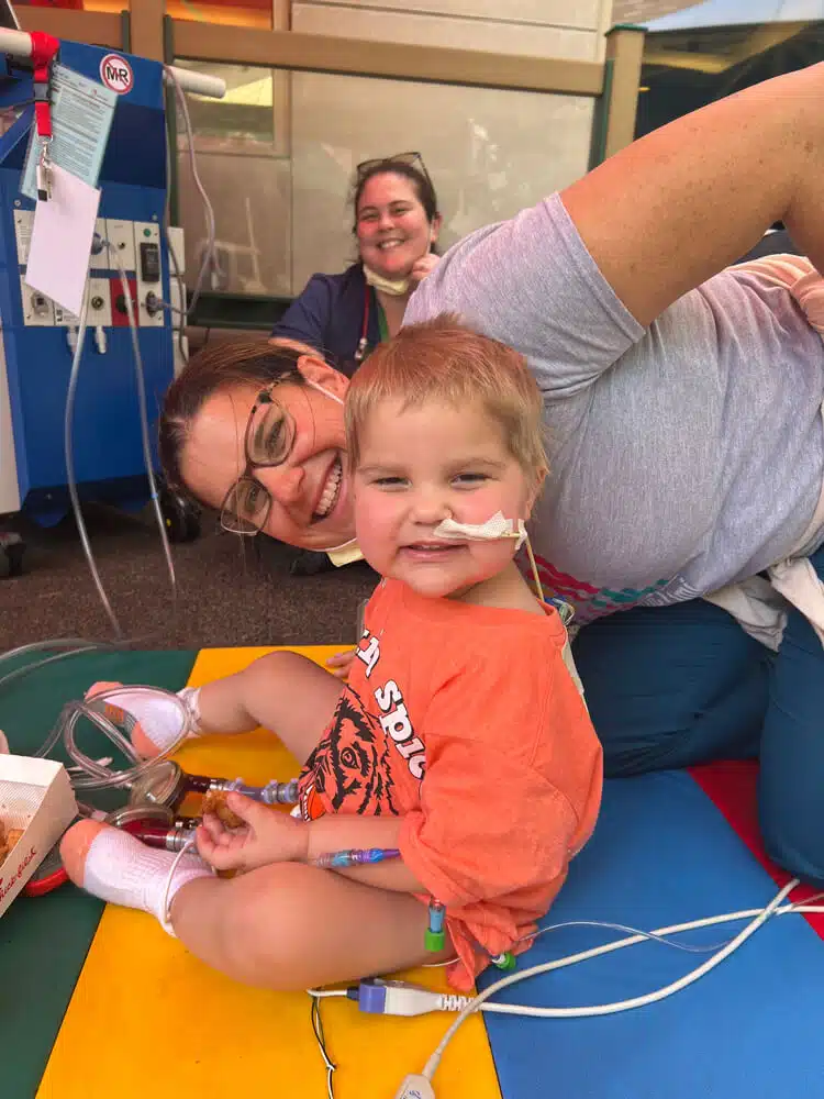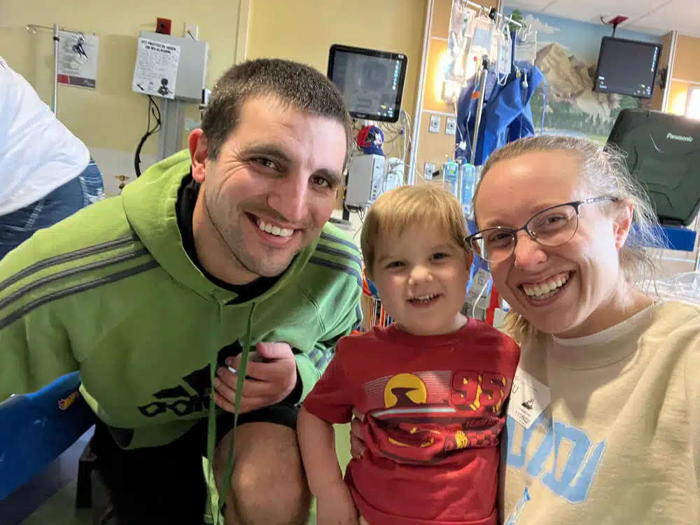 June 2021 – Tori and Zach’s son, Graham (then two years old), started complaining of his belly hurting. The following month, in July, Graham rapidly fell ill after returning home from a family hiking trip to West Virginia. Tori and Zach took him to a nearby urgent care where doctors ordered an x-ray. The x-ray revealed that Graham’s heart was bigger than expected. After a flurry of blood tests at their local hospital, HSHS St. Elizabeth’s Hospital in Shiloh, IL, Graham was transferred to SSM Health Cardinal Glennon Children’s Hospital. Tori and Zach were told he was in heart failure in the early morning hours. Graham was hospitalized immediately, diagnosed with severe dilated cardiomyopathy and remained in-patient for 6 weeks while he received IV (intravenous) medicines to improve the function of his heart. “The doctors thought his cardiomyopathy may have been caused by a virus, but they may never truly know,” recalled Tori.