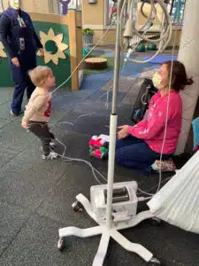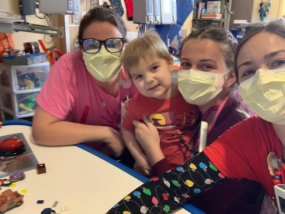 “Learning to parent a 3-year-old boy in a hospital with two large devices coming out of his body that is run by a large computer (airplane trolley cart size) that requires constant electricity is tricky,” said Tori. “He had candy, snacks, hotdogs, whatever he wanted and whenever he wanted so we can keep his calorie intake high and encourage him to eat by mouth! His days were filled with all things Cars – hiding cars around the unit, racing them on any surface he could find, doing Cars-themed crafts, and reading Cars-themed books. Graham was able to experience some much-needed distractions with the help of his army of caretakers. He loved going to the playroom, and his team coordinated getting him outside when the weather permitted. “Little did Graham know how much of a production it was to get him out of his room,” Tori recalled. “The machine that ran his BiVADs could only be unplugged for 30 minutes. At first, it took him about 20 minutes to walk halfway to the playroom. We eventually got it down to under 8 minutes. We would always take a wheelchair in case we cut it close on time and needed to speed up the process. It takes 6 hours for the machine to recharge fully, and the locations with outlets were limited. We all breathed a sigh of relief once we got to his location and his device plugged into a working outlet. I cannot say it enough – the PICU, Cardiology, Cardiothoracic, Therapy Services, and Child Life staff consistently went above and beyond to normalize his life and get him out of his four walls,” said Tori. “Graham was continuously surrounded by so much love. The nurses were true MVPs, always coming to play and interacting with Graham. The music therapist and child-life specialist worked with Graham to help him express his big feelings. And THOR – Graham grew very fond of the service dog, Thor. He lit up every time Thor and his handler, Abbie came by! I appreciated every moment I got to spend with Graham. He was awake, alert, happy, ornery, joking, and FULL toddler! We know that not every parent can “enjoy” those kinds of moments during their wait. We are so very grateful we had those. At the same time, we were trying to process anticipatory grief for the family, who would ultimately gift Graham with a new heart,” Tori said.