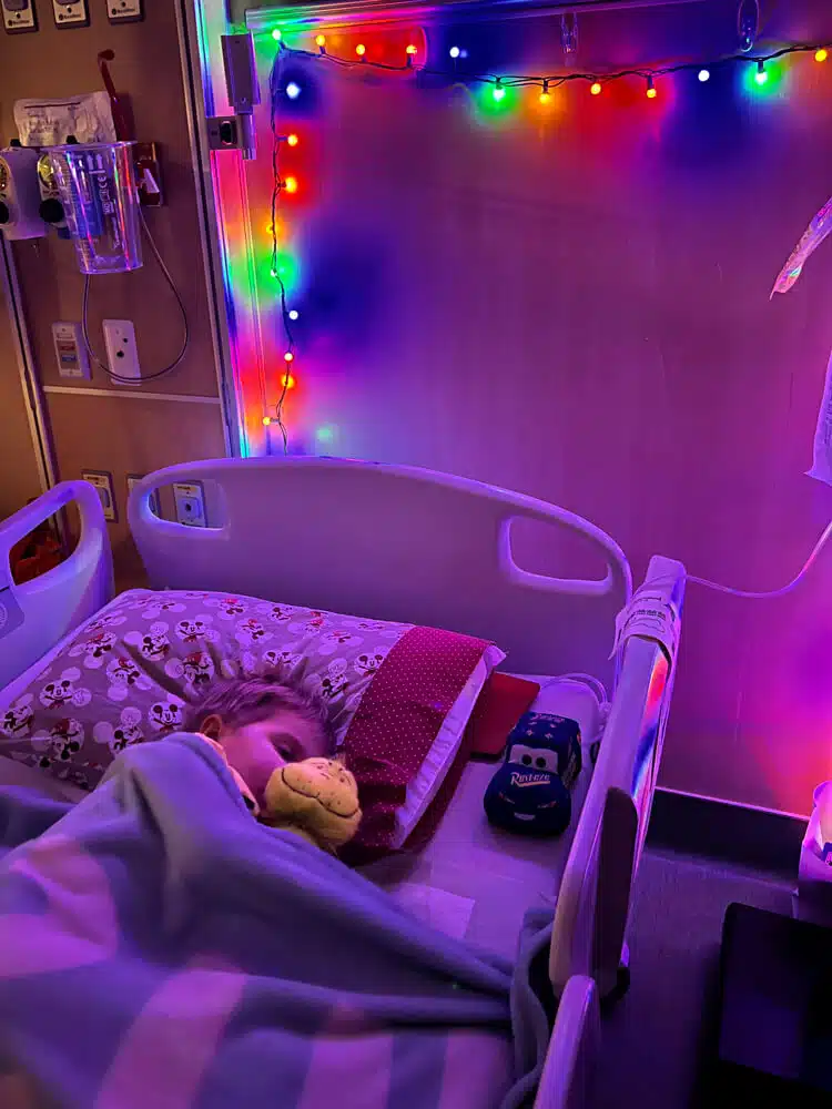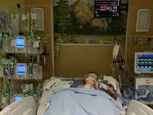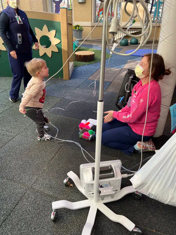Graham would remain in the hospital until a heart transplant was available. “We were told we could be waiting anywhere from 6-12 months,” Tori said. The weeks following Graham’s BiVAD placement surgery were a roller coaster and brutal. They were filled with chest tubes, central lines, nasogastric tubes, withdrawal symptoms from pain medications, fluid imbalances, and so many other challenging things too numerous to list. Despite these hurdles, the blessings were great. Graham was able to transition to the Berlin heart (a type of BIVAD with shorter external tubing and pulsatile flow, allowing greater mobility and temperature regulation) on July 5th. The entire staff- nurses to occupational therapists, physical therapists, Child Life therapists, and more – remained creative, innovative, and vigilant in their efforts to keep Graham safe, mobile, and entertained. Surgical recovery transitioned to navigating weeks and months of “life” in the Pediatric Intensive Care Unit.