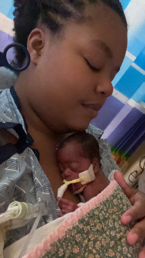 Throughout Deja’s pregnancy, the baby measured small in utero. Her placenta was thinner than normal, and her team cautioned that an early delivery should be anticipated. “I was admitted to SSM Health St. Mary’s when I was 24 weeks. I remember it was a Wednesday, and I delivered Jadai two days later on Friday, August 16, 2024. I spent two more days in the hospital because I lost so much blood. But Jadai was immediately transferred to Cardinal Glennon’s Neonatal Intensive Care Unit. She only weighed 1lb. 3 oz and she was small for gestational age at 25 weeks,” Deja said. “I was a first-time mom with no idea what to expect from a full-term baby, much less what to expect from a preemie.”