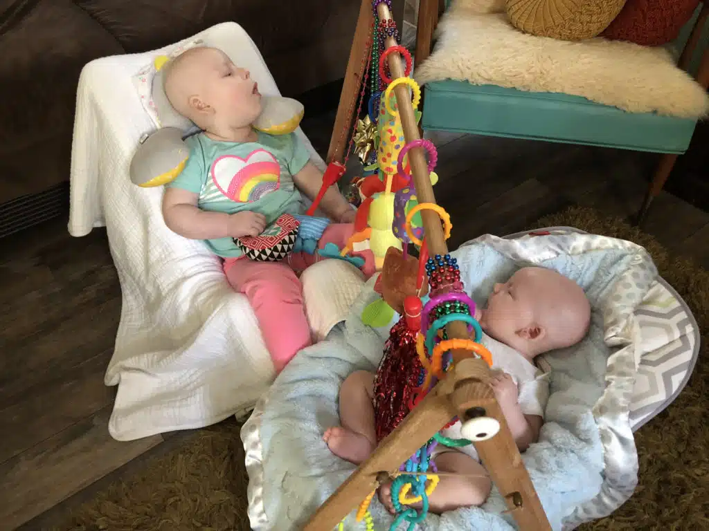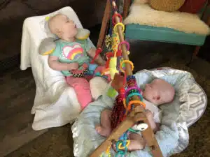 They enjoy being talked to, sung to, danced with, snuggled, watching movies, playing with switch-adapted toys (thanks to Randy’s tinkering skills), having books read to them, and visits from their adoring cousin, Josey. On warm days, they enjoy being in their standers, watching the leaves dance in the trees and bubbles float by in the breeze.